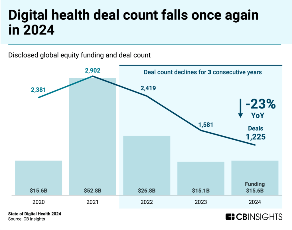 Mirroring trends in the broader venture market, AI proved to be a bright spot amid the downturn in digital health deals. In 2024, AI-focused companies secured 42% of digital health funding and accounted for 31% of deals — both record highs.